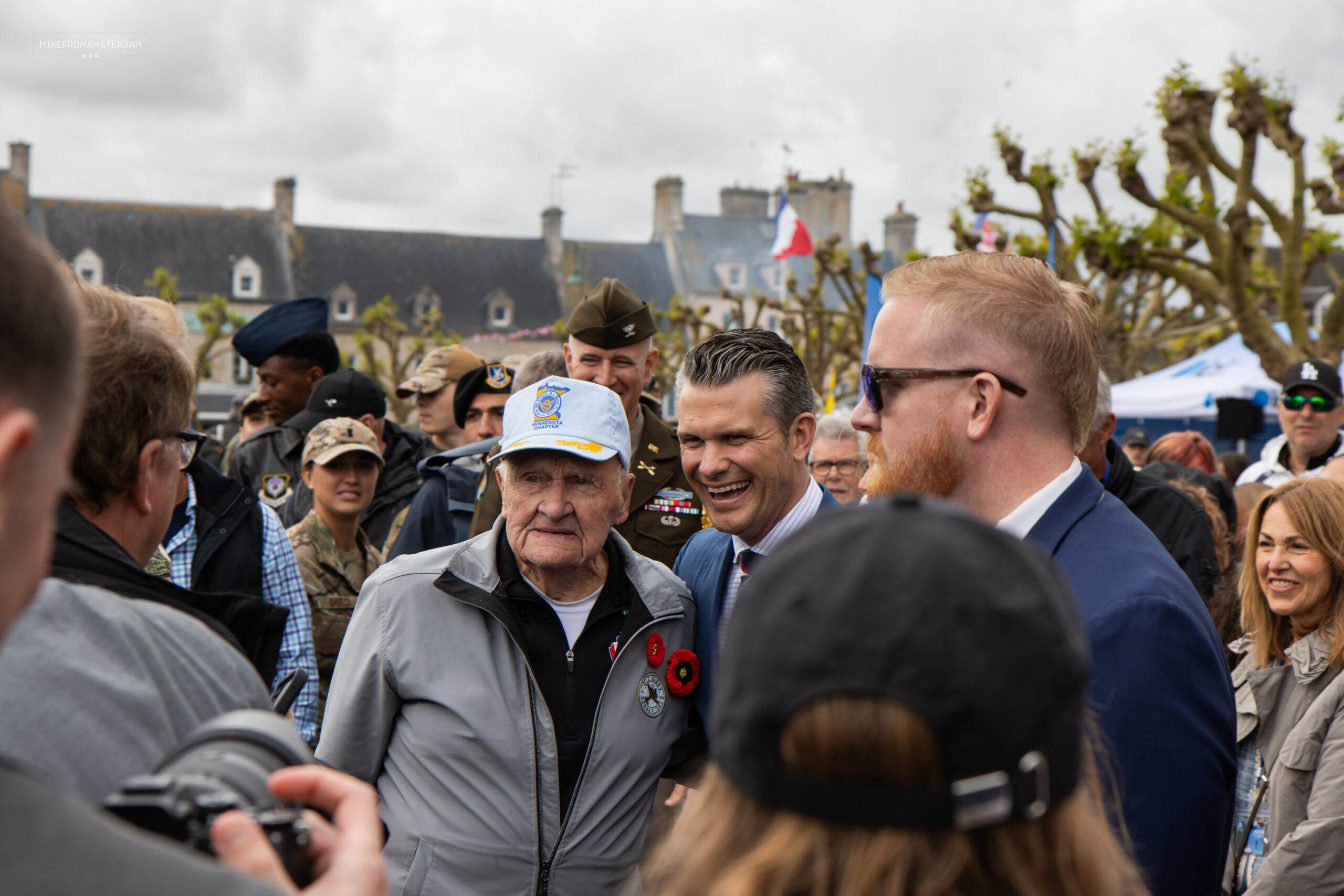 Op 6 juni waren we in Sainte-Mère-Église. Hier was de hele dag een groot festival met re-enacters, oude voertuigen en allerlei leuke standjes. Er waren ook heel veel militairen vanuit verschillende landen aanwezig. Dit dorpje is bekend vanwege de parachutist John Steele die met zijn parachute vast kwam te zitten aan de kerktoren. Toevallig kwam de Amerikaanse minister van defensie Pete Hegseth nog even langs, en die ging op de foto met een veteraan.